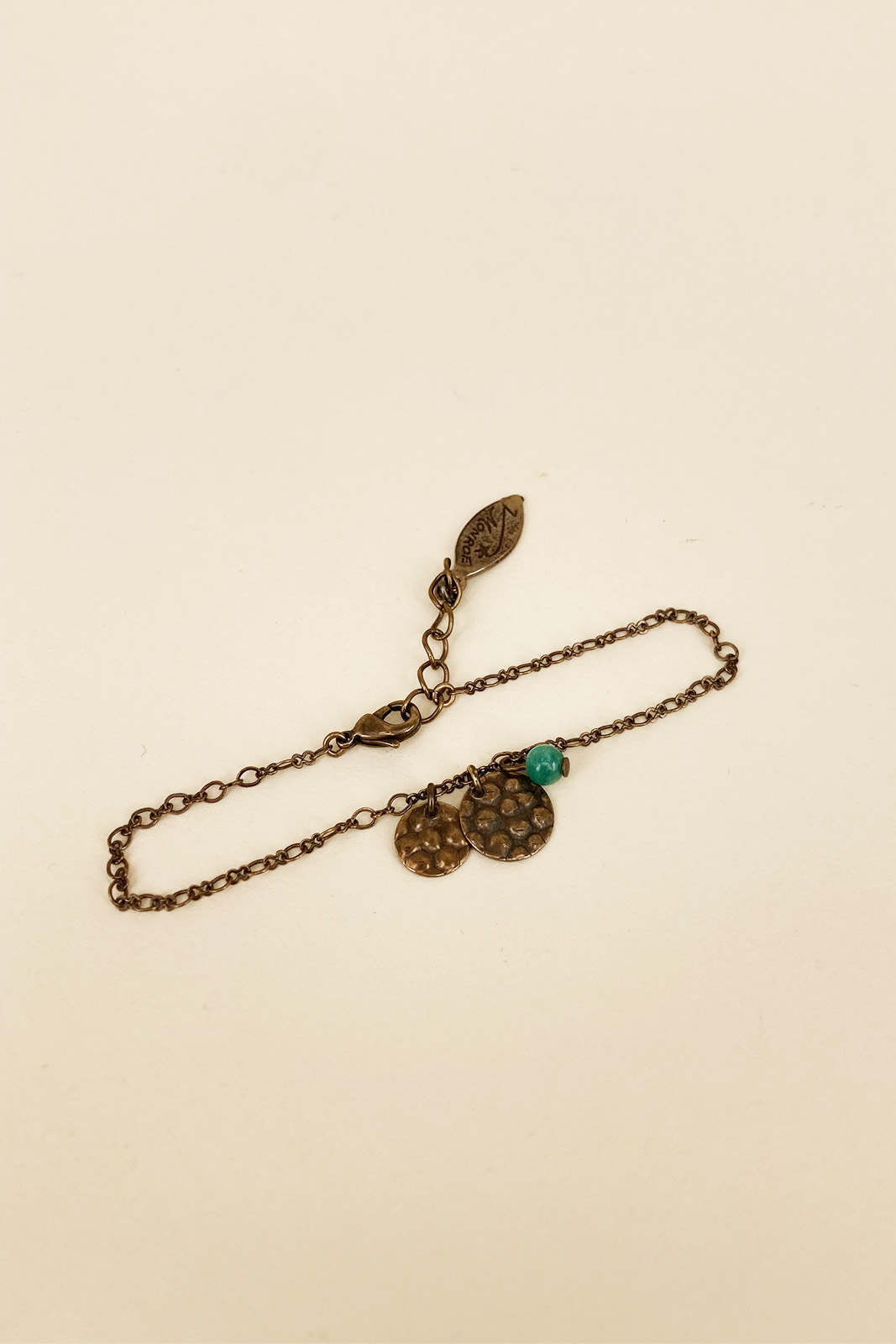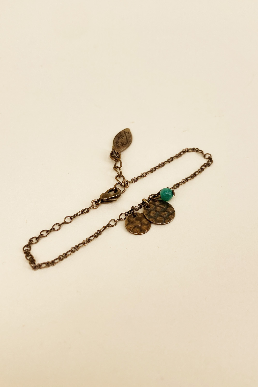 Der Armband Kahena von Virginie Monroe besteht aus vergoldete Messing und hat eine grüne Perle.