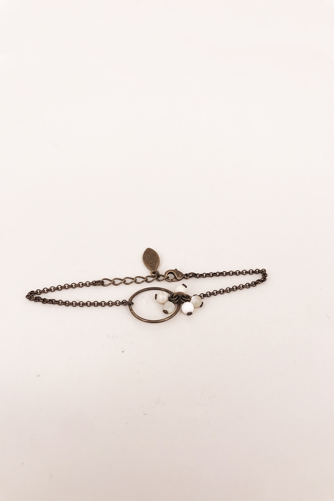Das Armband in der Farbe Ecru von Virginie Monroe besteht aus vergoldetem Messing.