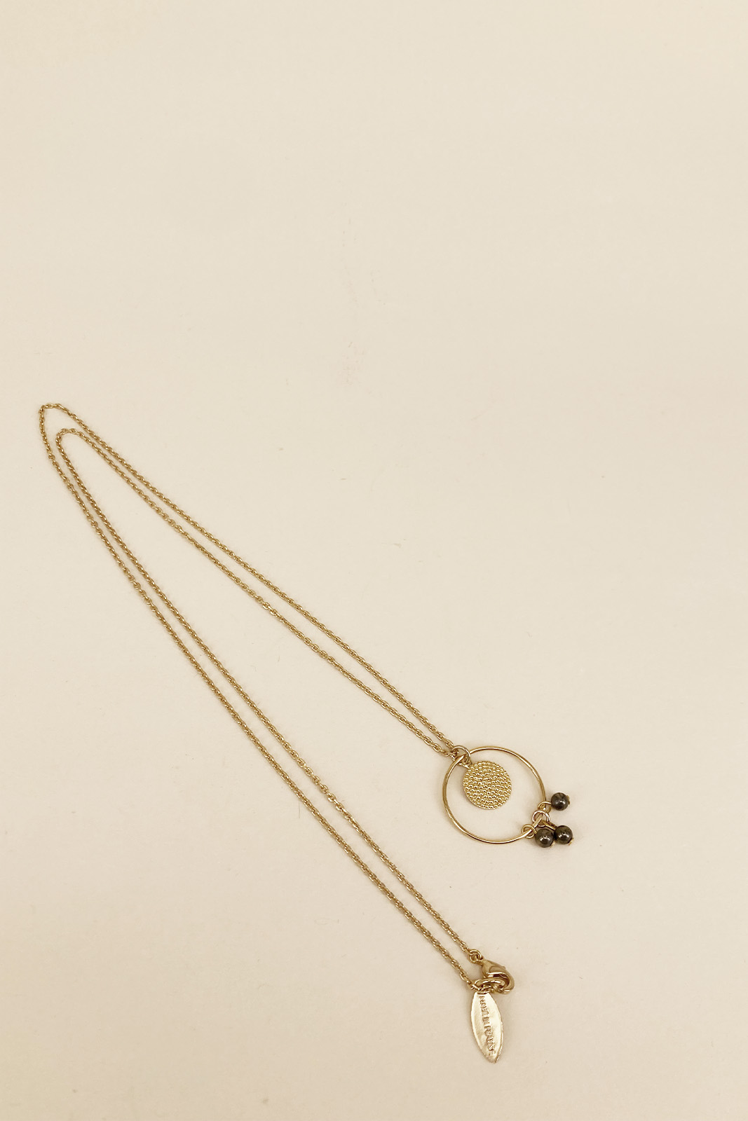Die lange Kette Java in der Farbe Mousse von Virginie Monroe besteht aus vergoldete Messing und hat mineralen Perlen.