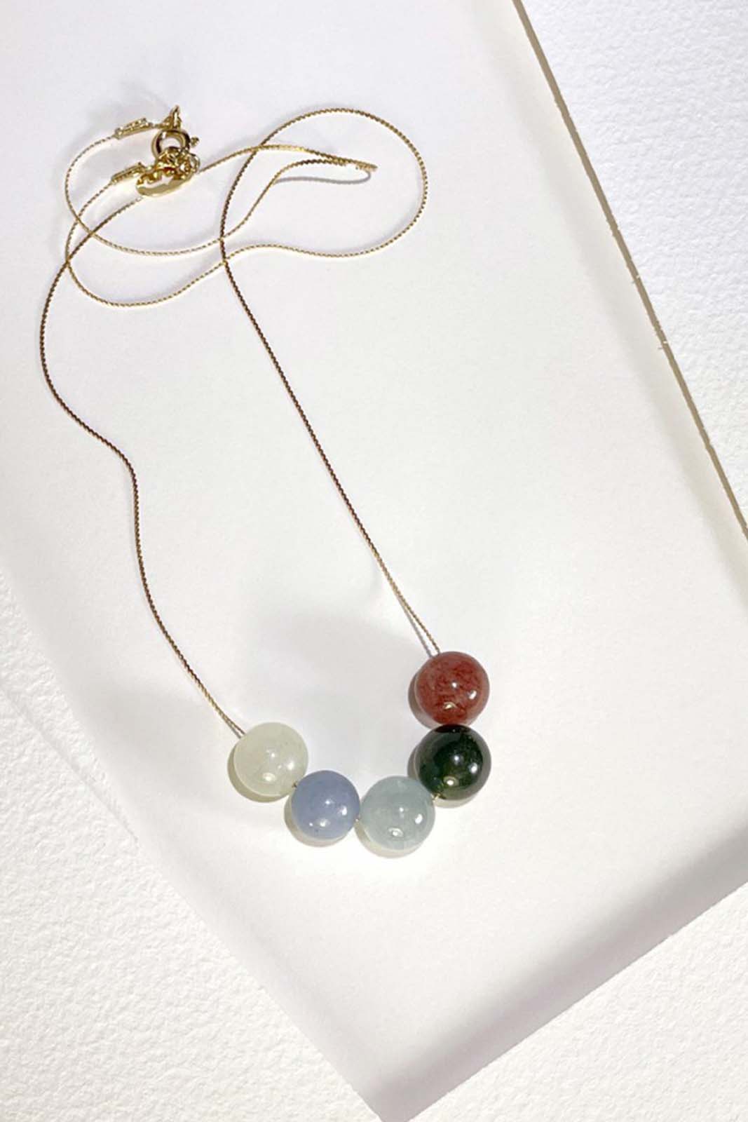 Perlenmaterial (von links nach rechts): roter Muskovit, Achat, Aquamarin, Angelit und Jade