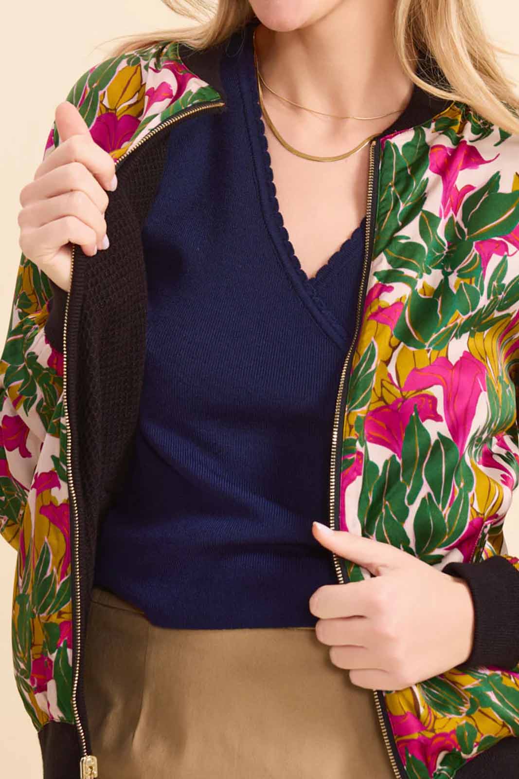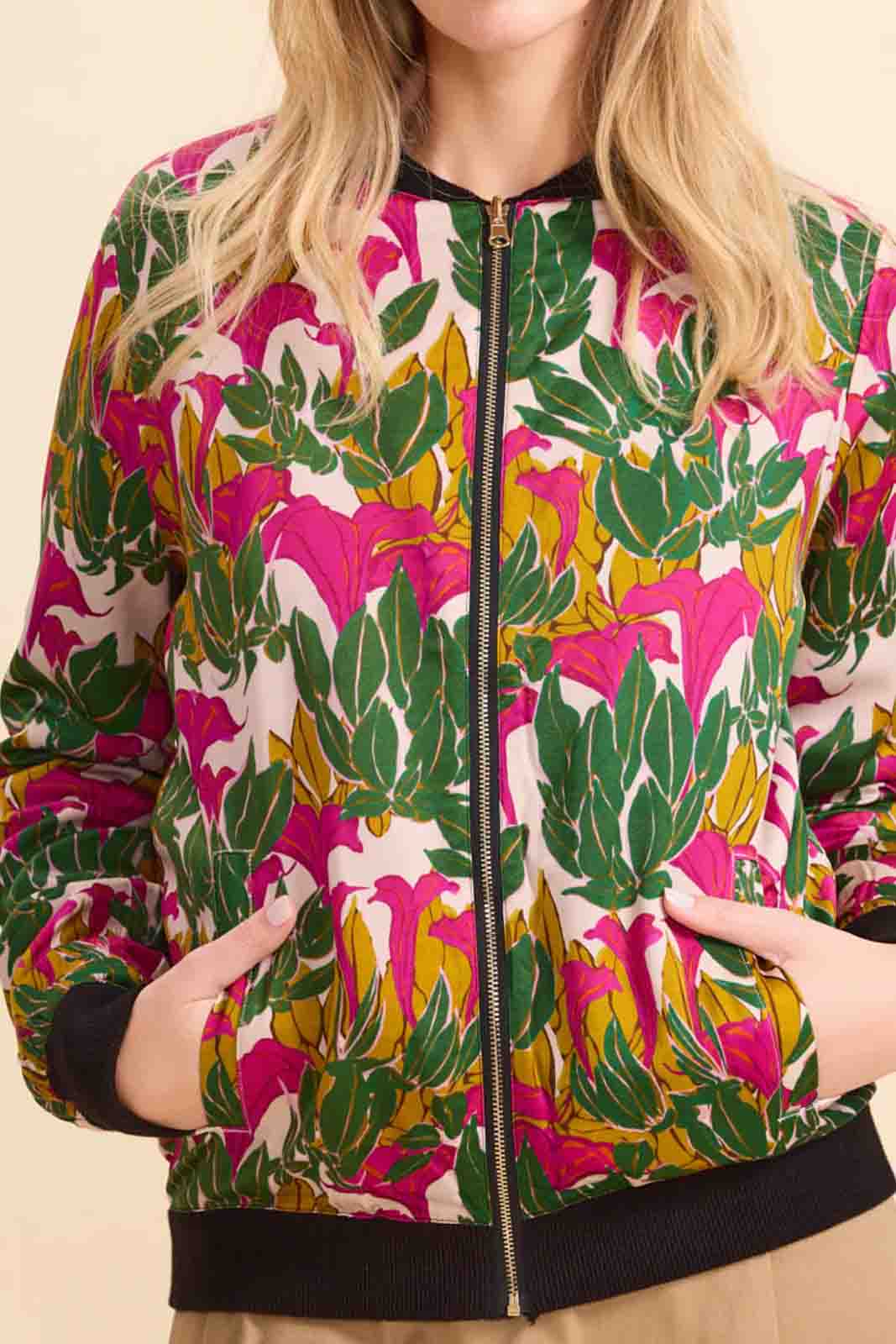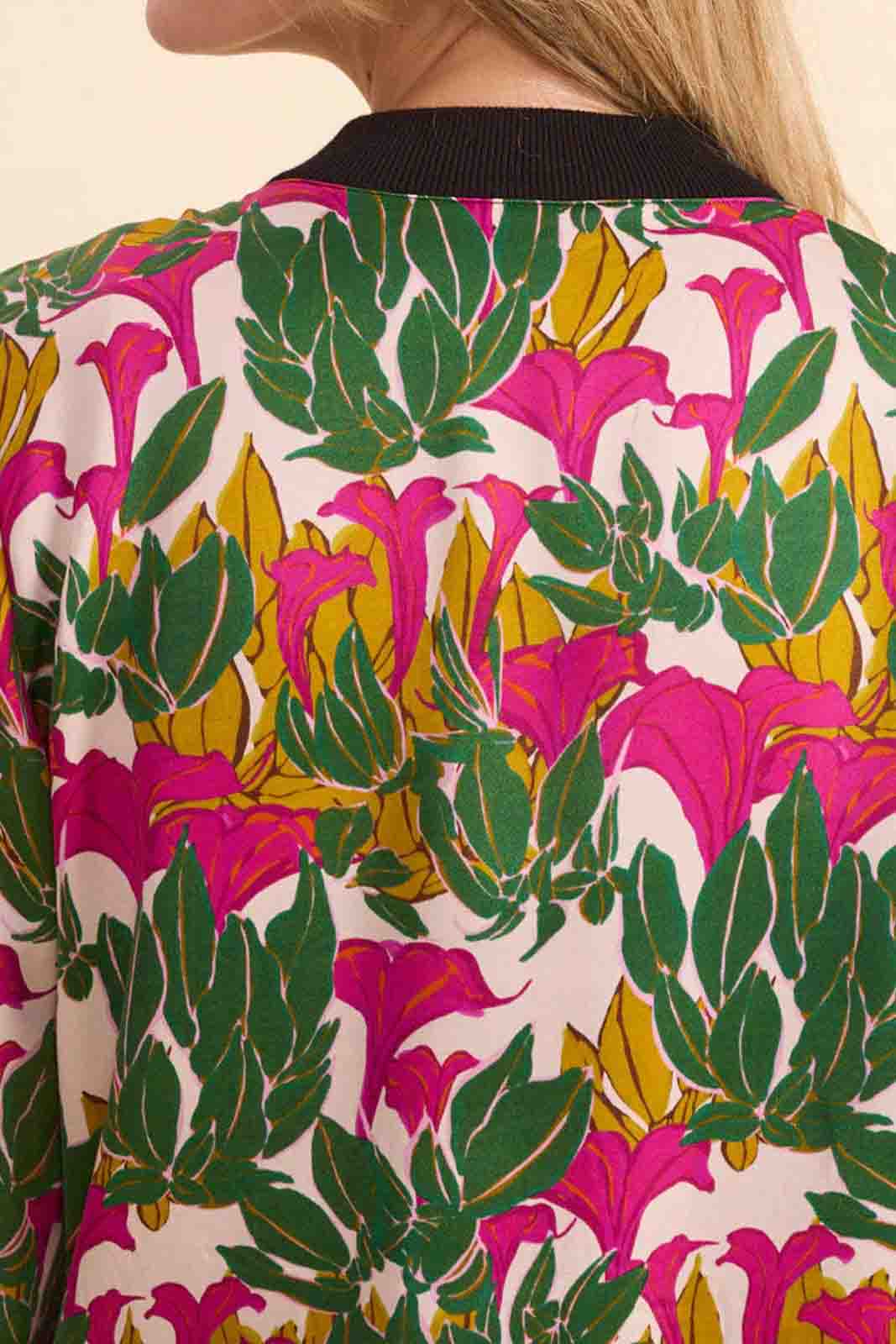 Die Jacke Zoe in der Farbe Clochette von Marie Sixtine besteht aus 100% Viscose Satin (Print-Seite) und 100% Bio-Baumwolle (einfarbige Seite).