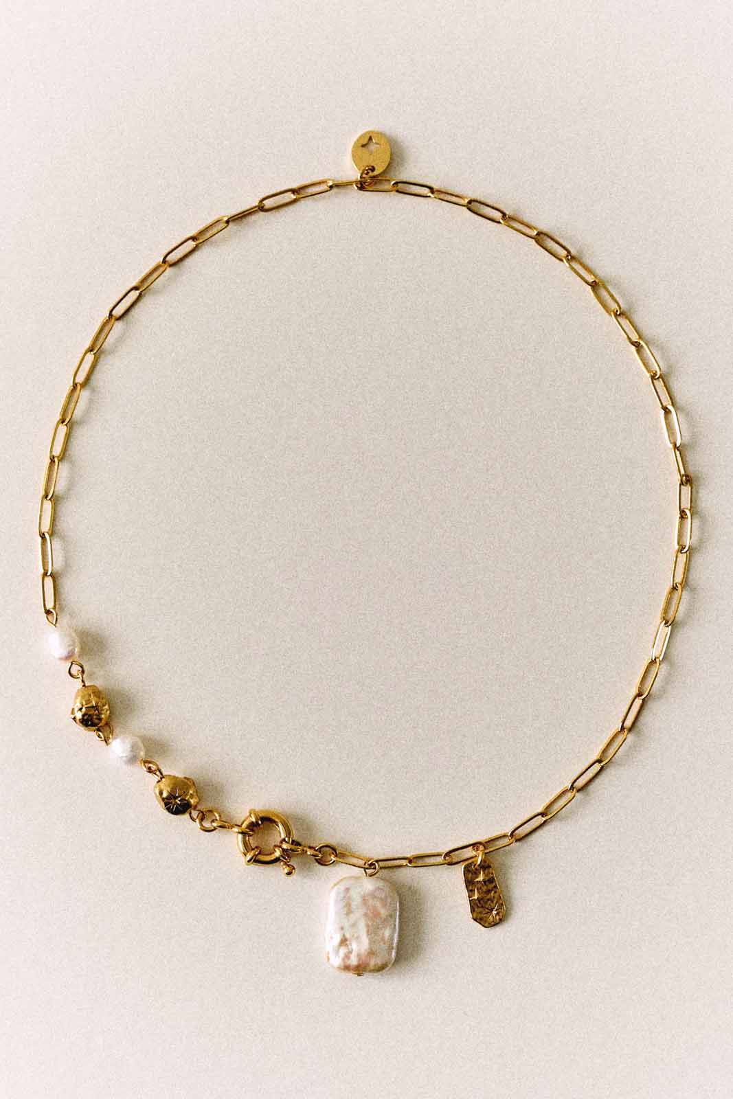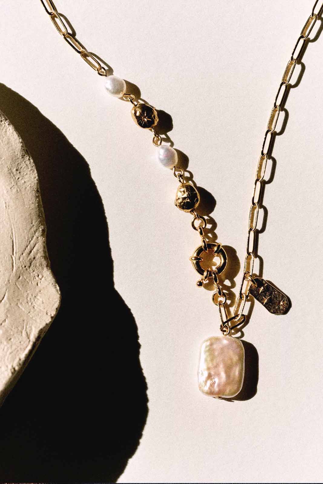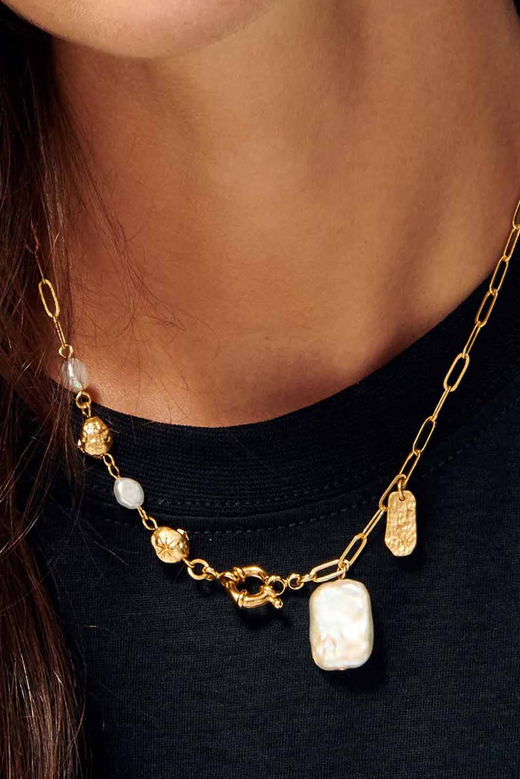 Die Kette Choya Pearl von Sessun besteht aus 80% vergoldetes Messing und 20% Süßwasserperle.
