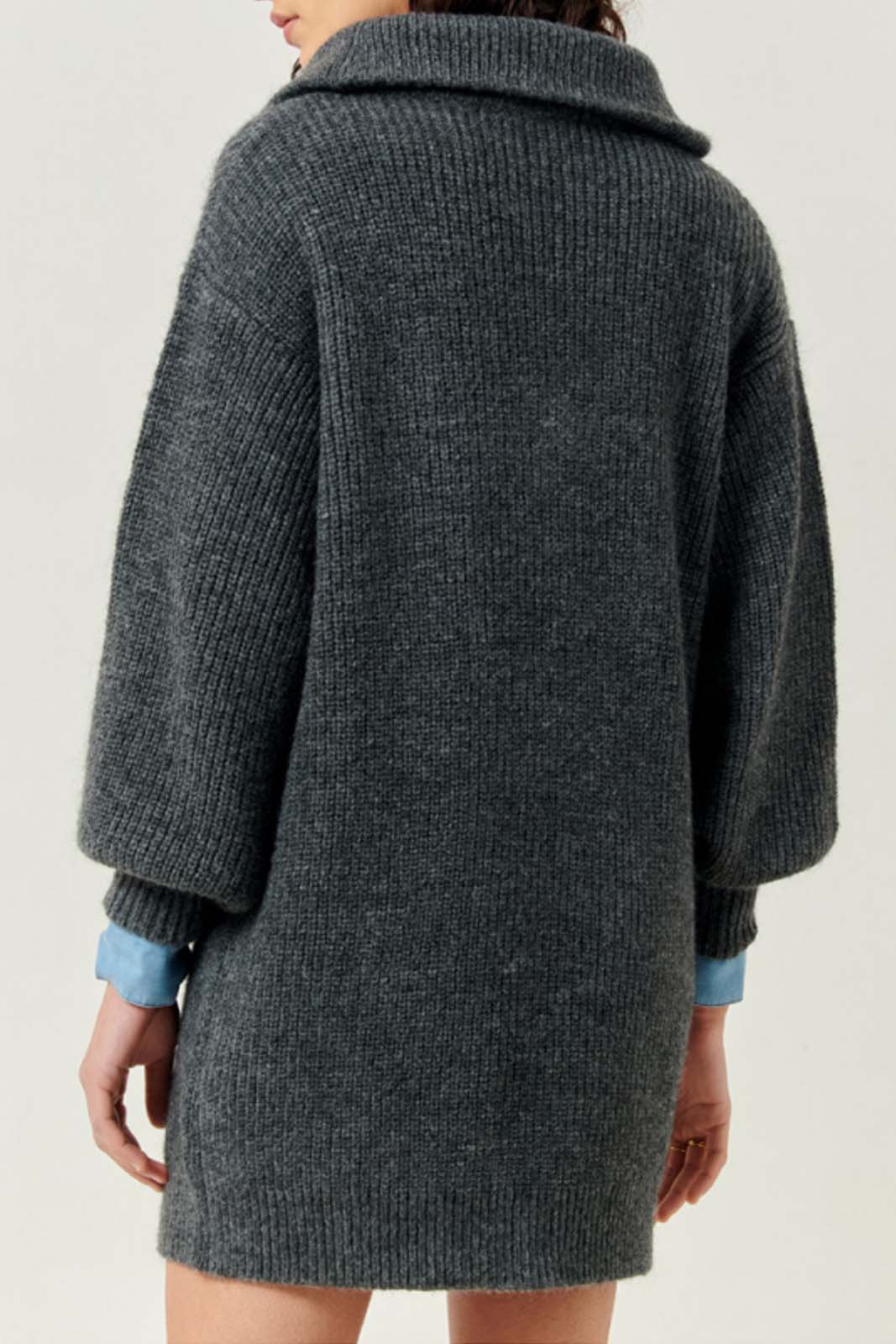 Das Strickkleid Eireann in der Farbe Graffit von Sessun besteht aus 40% recycelte Polyamid, 24% Acrylic, 18% Alpaca und 18% Wolle.