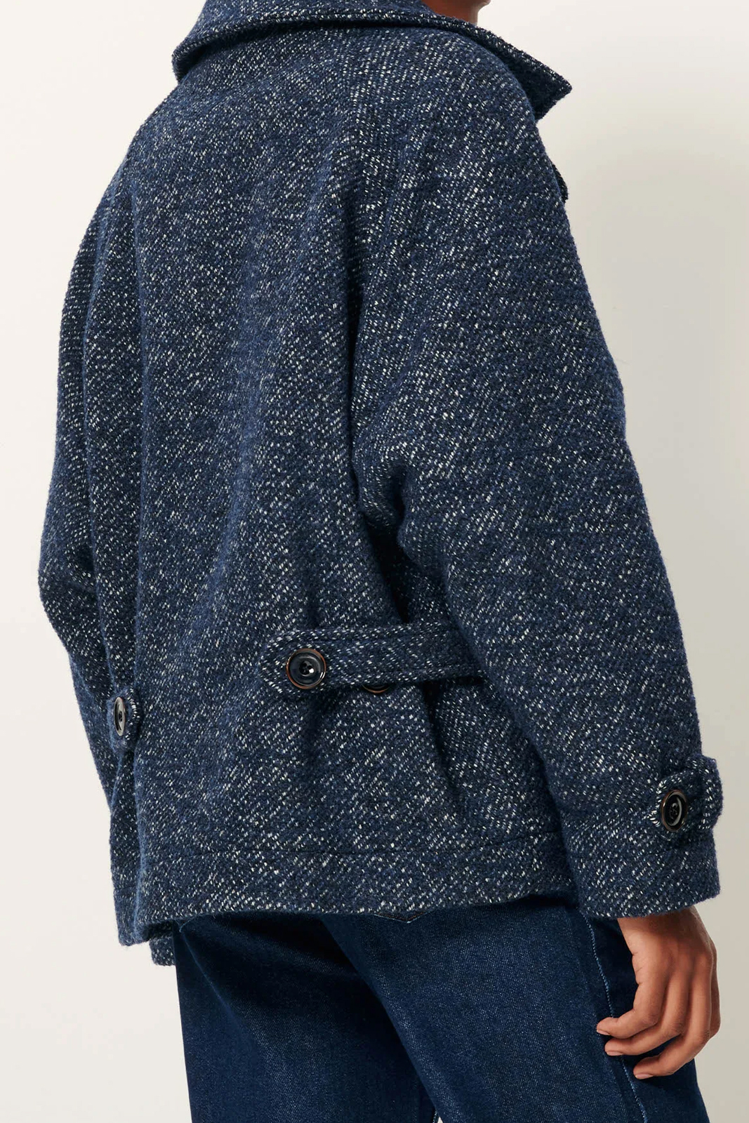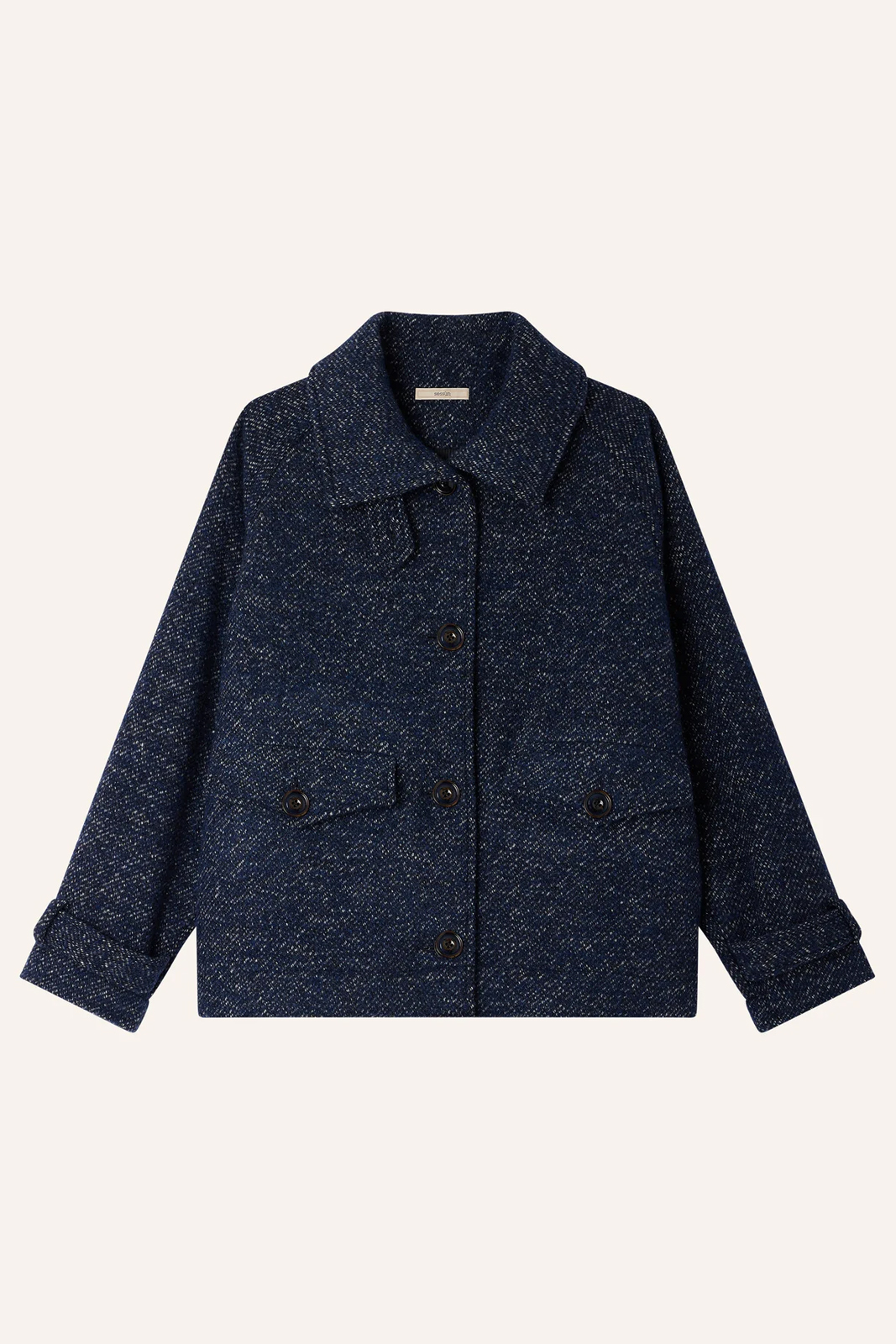 Der Mantel Lee Valley in der Farbe Denimwool von Sessun besteht aus 42% Wolle, 45% Polyester, 11% Polyamid und 2% anderen Fasern.