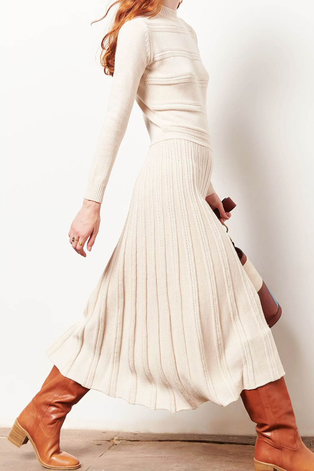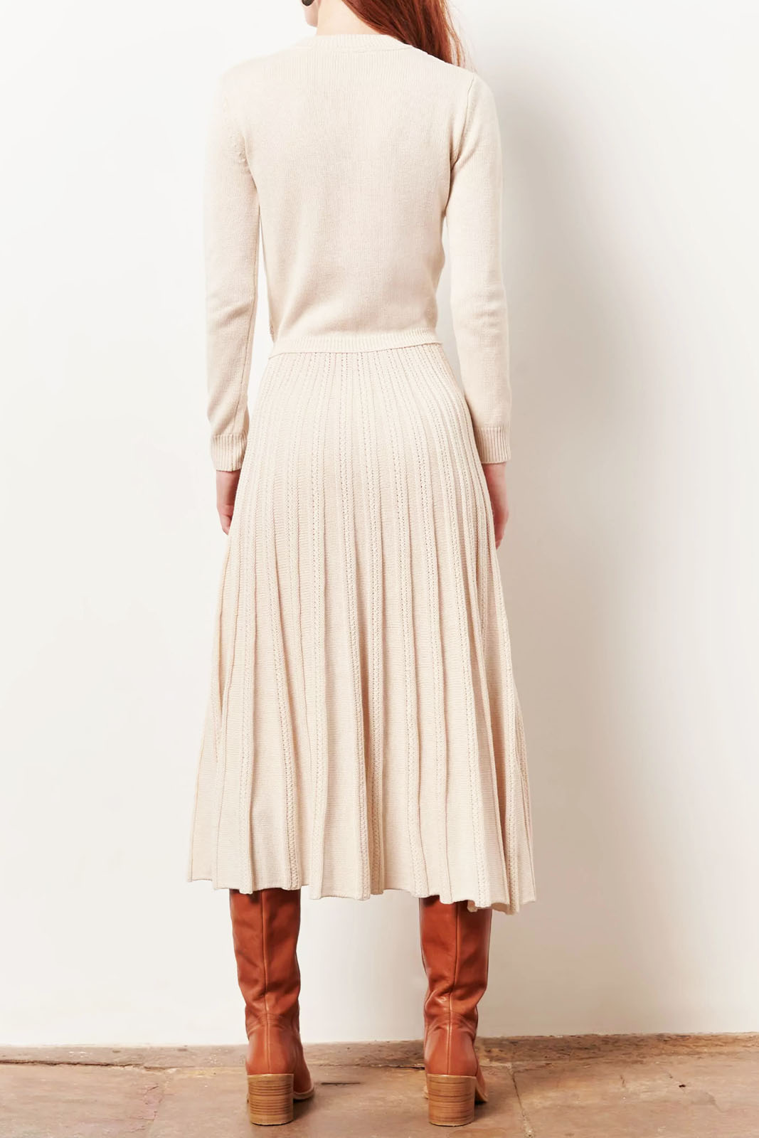 Das Kleid Lucia in der Farbe White Cloud von Sessun besteht aus 40% Polyamid, 30% Viscose und 30% Wolle.
