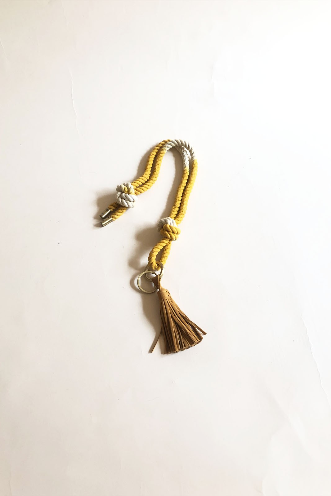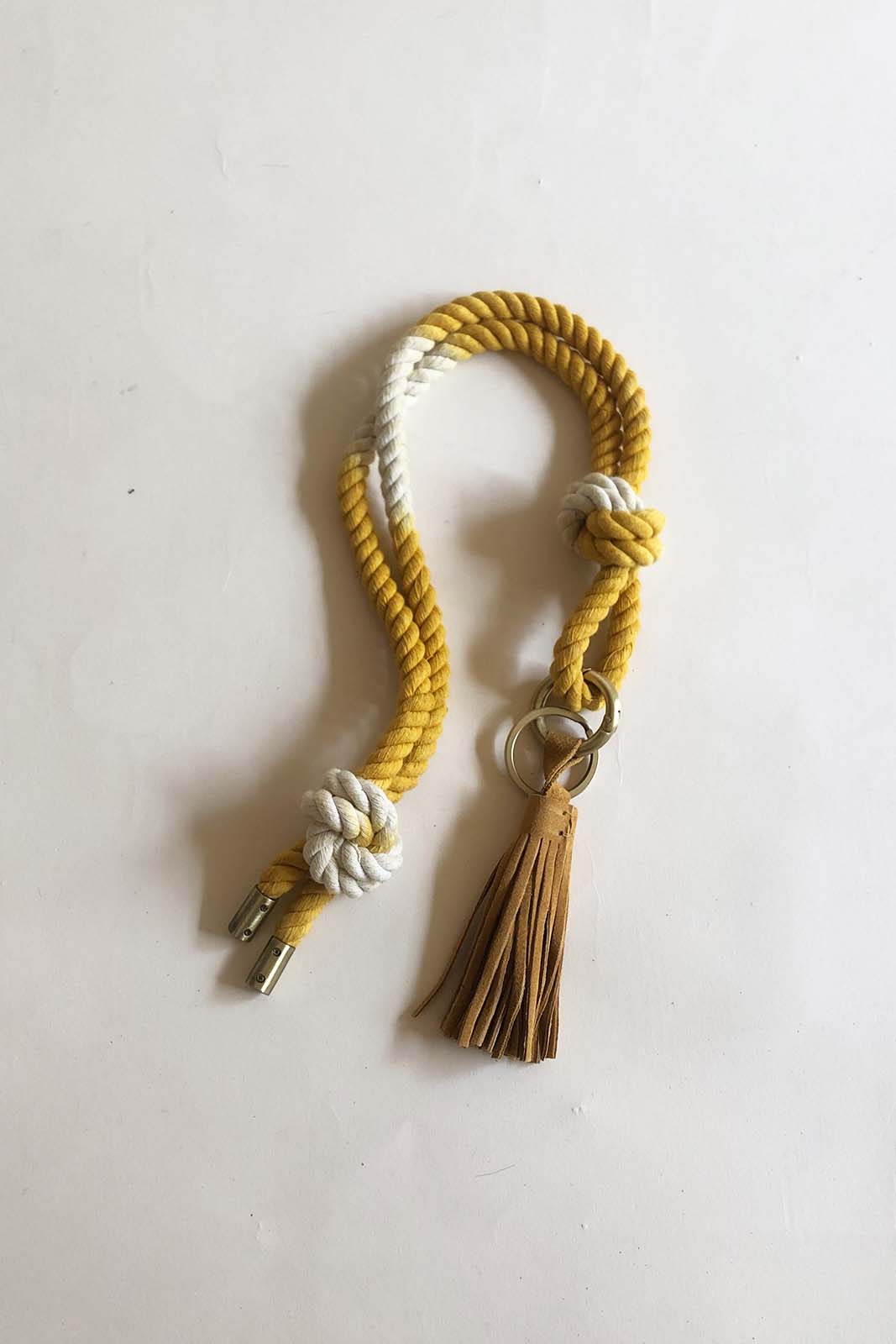 Der Schlüsselanhänger Lukay in der Farbe Sunglow von Sessun besteht aus 50% Baumwolle und 50% LWG-zertifiziertes Spaltleder.