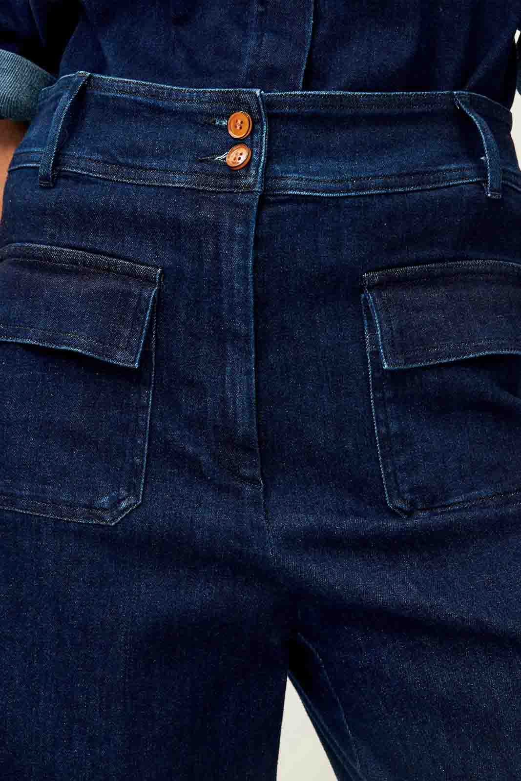 Die Hose Manhattan in der Farbe Denim Blue von Sessun besteht aus 79% Baumwolle, 20% recycled Polyester und 1% Elastan. Der Stoff besteht aus gewaschenem Denim-Twill und Indigo-gefärbten Garnen.