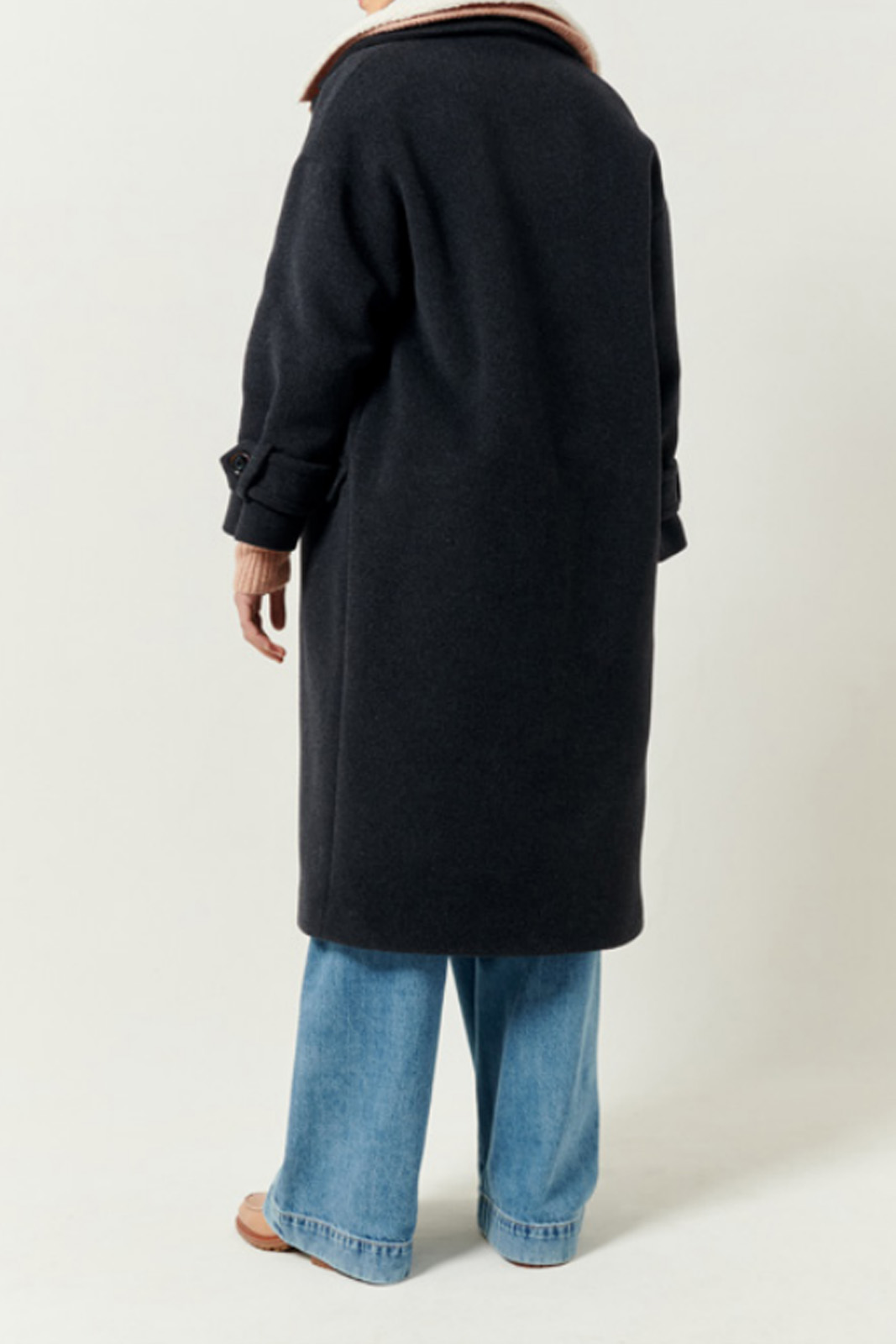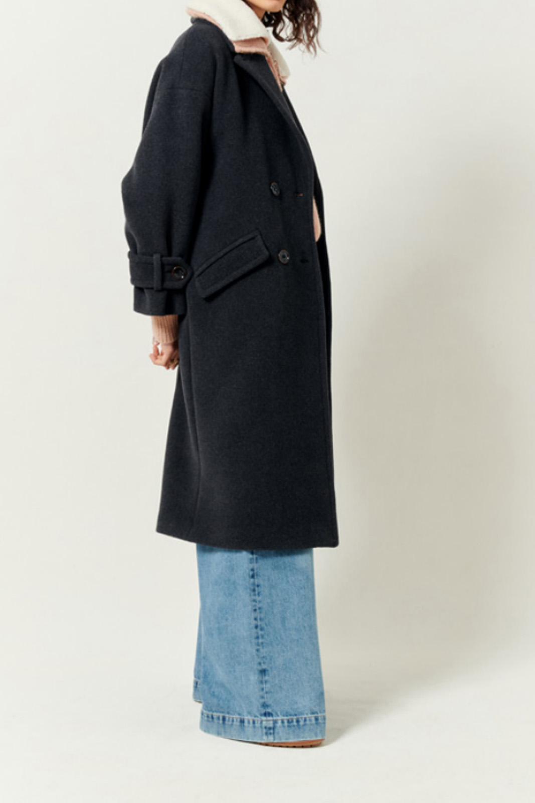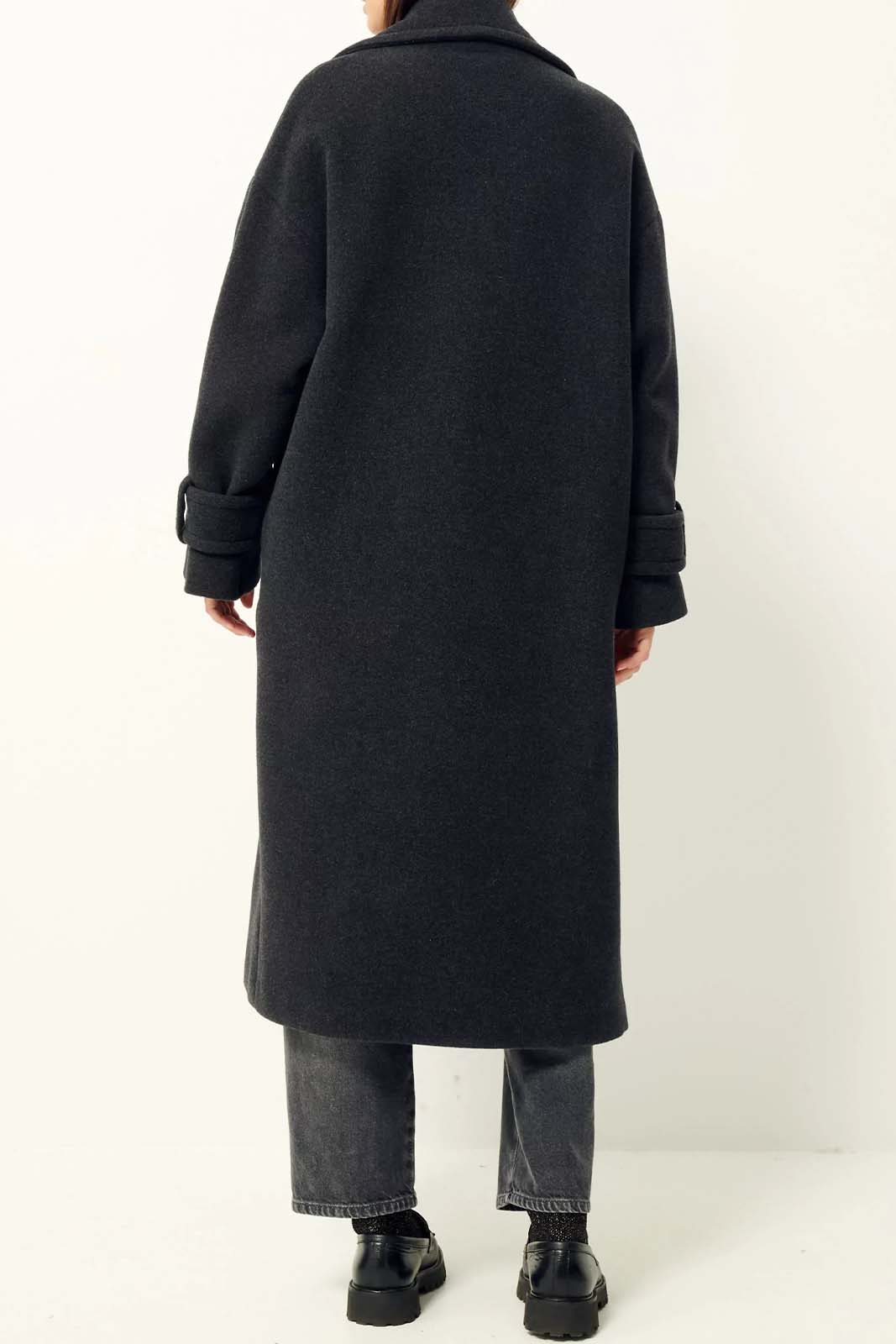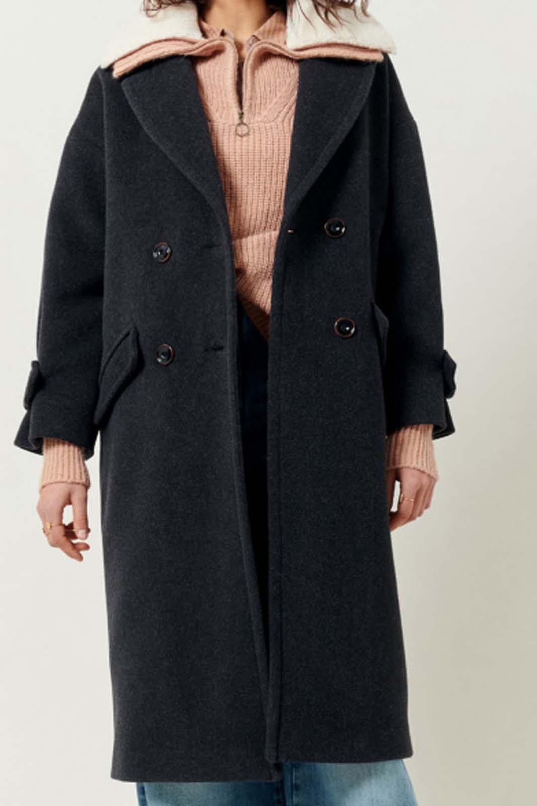 Der Mantel Mia in der Farbe Carbonella von Sessun besteht aus 70% recycelte Wolle und 30%  Polyamid.