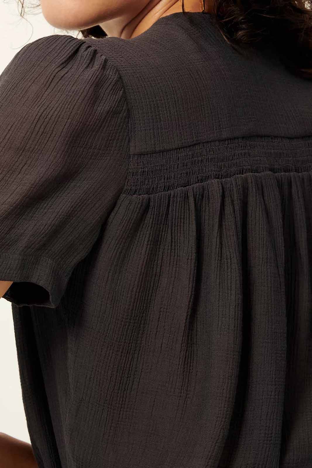 Die Bluse Siama in der Farbe Moonless von Sessun besteht aus 75% nachhaltige Viskose und 25% Polyamid.
