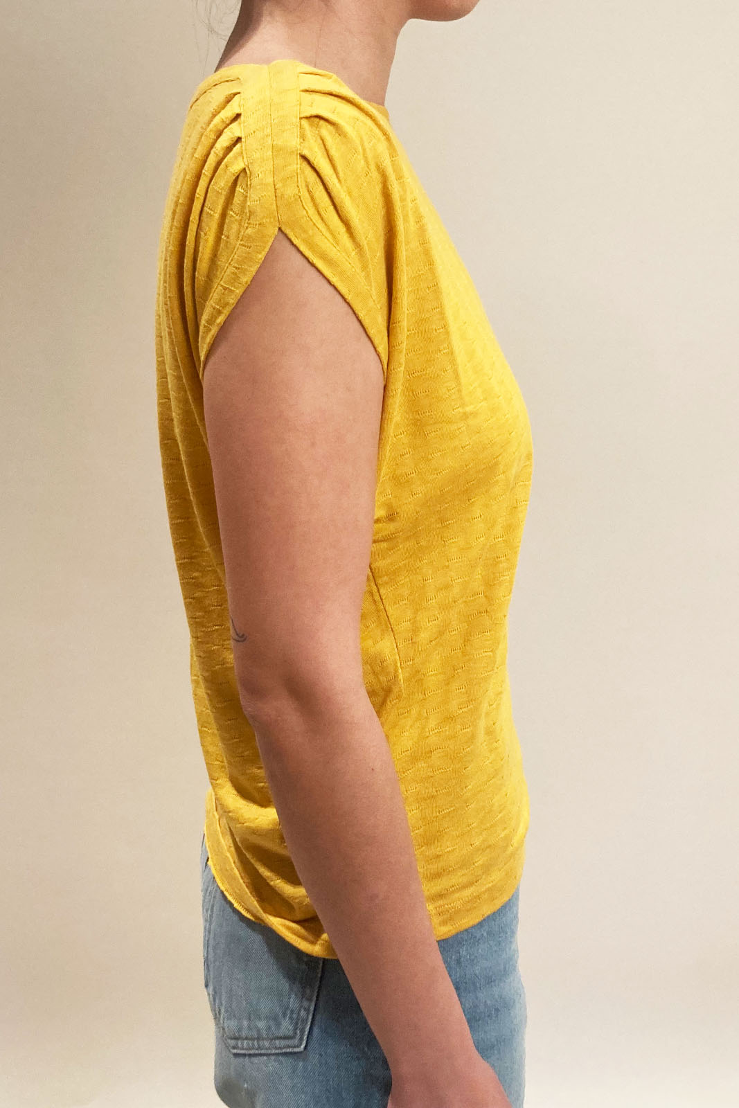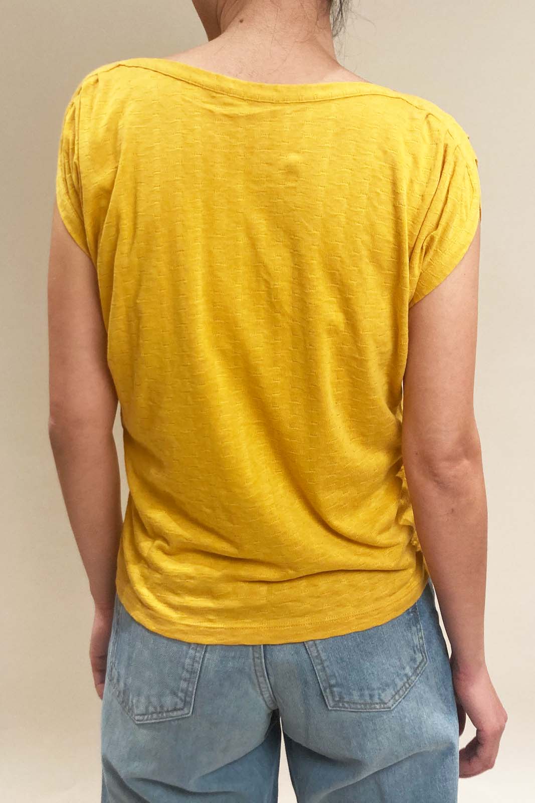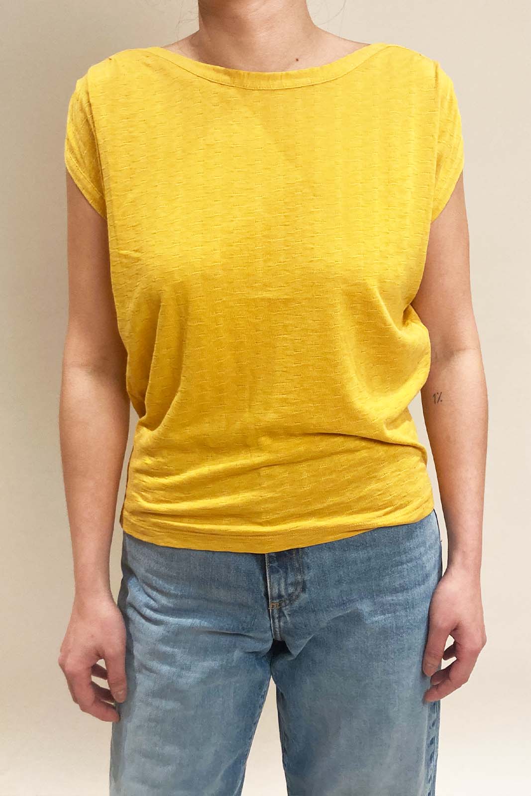 Das Top Sixto Jacquard in der Farbe Sunny von Sessun besteht aus 67% Lyocell 33% Baumwolle.