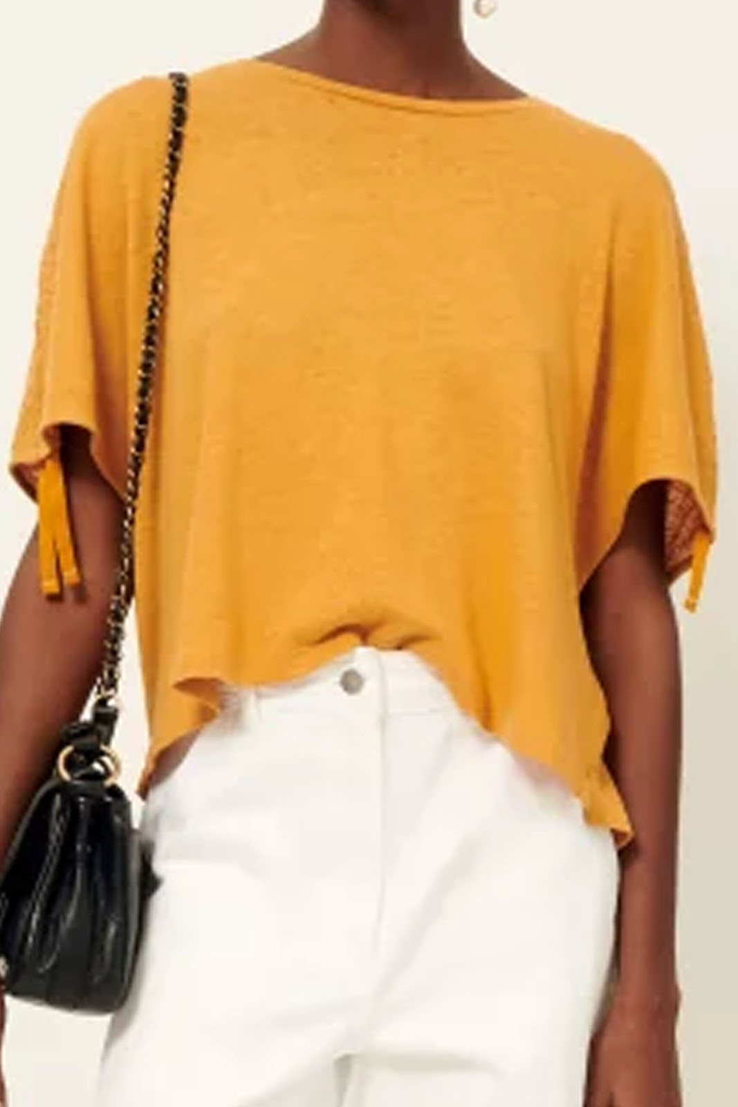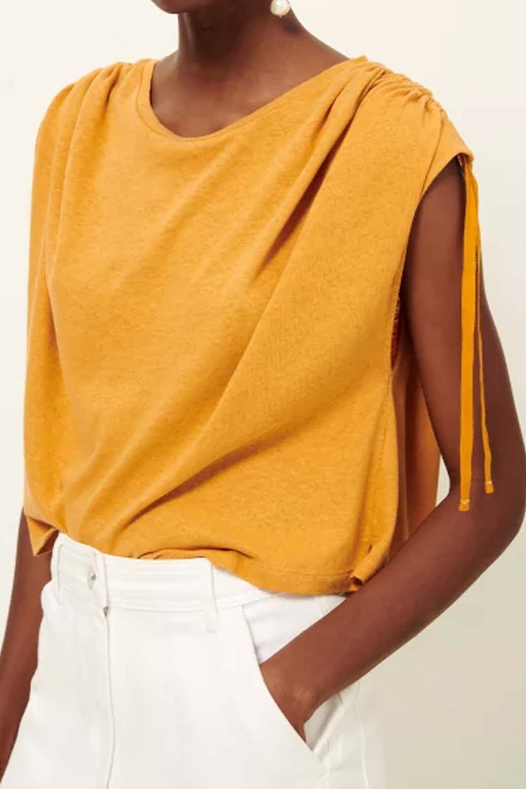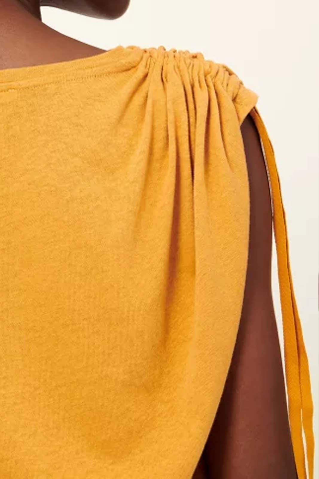 Das Top Thissio in der Farbe Inca Gold von Sessun besteht aus 70% Baumwolle und 30% Leinen.