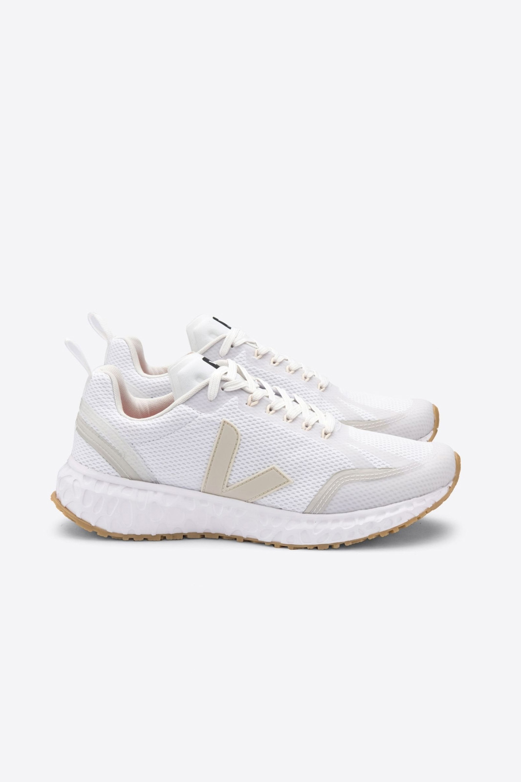 Die Running Schuhe Condor white pierre von Veja bestehen aus 53% bio und recycled-base Materialien, unter andere Alveomesh (100% recycled plastic bottle) und wildem Gummi aus Amazonien.
