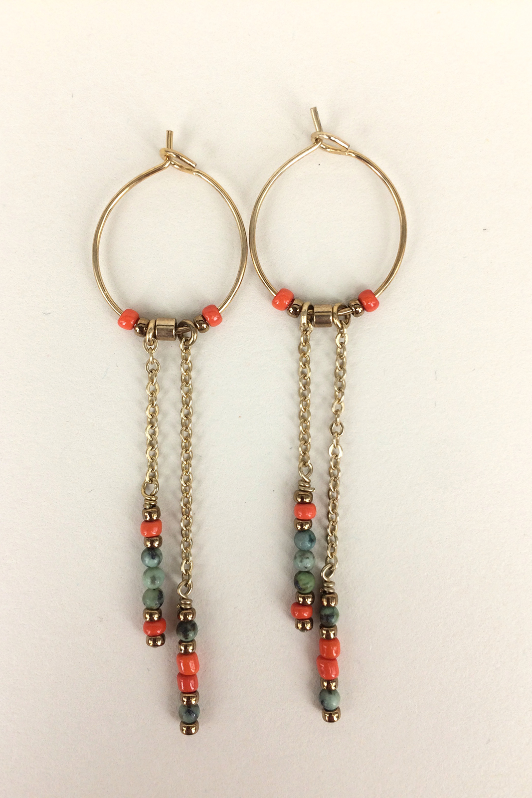 Die Ohrringe Gypsy von Virginie Monroe bestehen aus Messing mit Bronze verblättert und haben Perlen aus Coral und Amazonite.