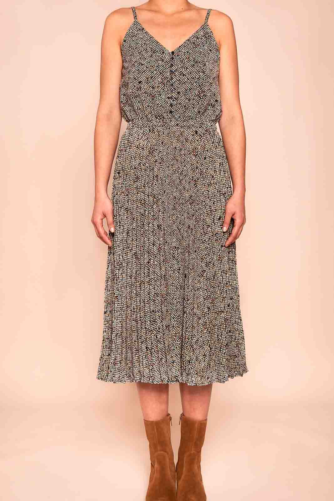 Das Kleid Getty in der Farbe Tobablue von Sessun besteht aus 97% Polyester recycled und 3% Elastane. Elastik an der Taille für Komfort und perfekte Passform. Unser Model trägt die Grösse S.