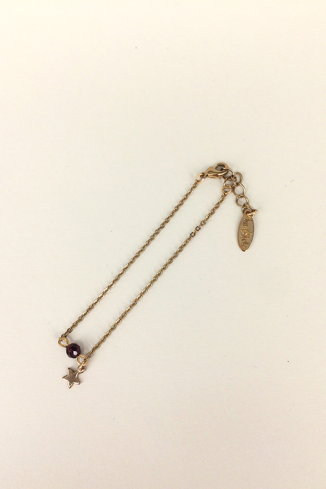 Das Armband von Virginie Monroe ist aus vergoldetem Messing. Die Kette ist 18,5 cm lang und hat ein Stern und eine Grenat Perle.